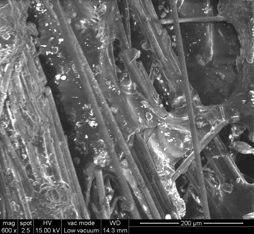 Figure 1. SEM image depicts the PEEK with 20 weight percentages of basalt filler. mag: Magnification of the sample is set in the order of 600 times; spot: The focus length of the beam of the spot is 2.5 mm; HV: High voltage SEMs (HVSEM) with large specimens are set as 15kV; Vac mode: Vacuum mode, which is set as Low Vacuum for our samples that are nonconductive or poorly conductive; Wd: Working distance is the distance between the specimen and the lower pole piece; The Working distance (wd) is fixed at 14.3 mm.