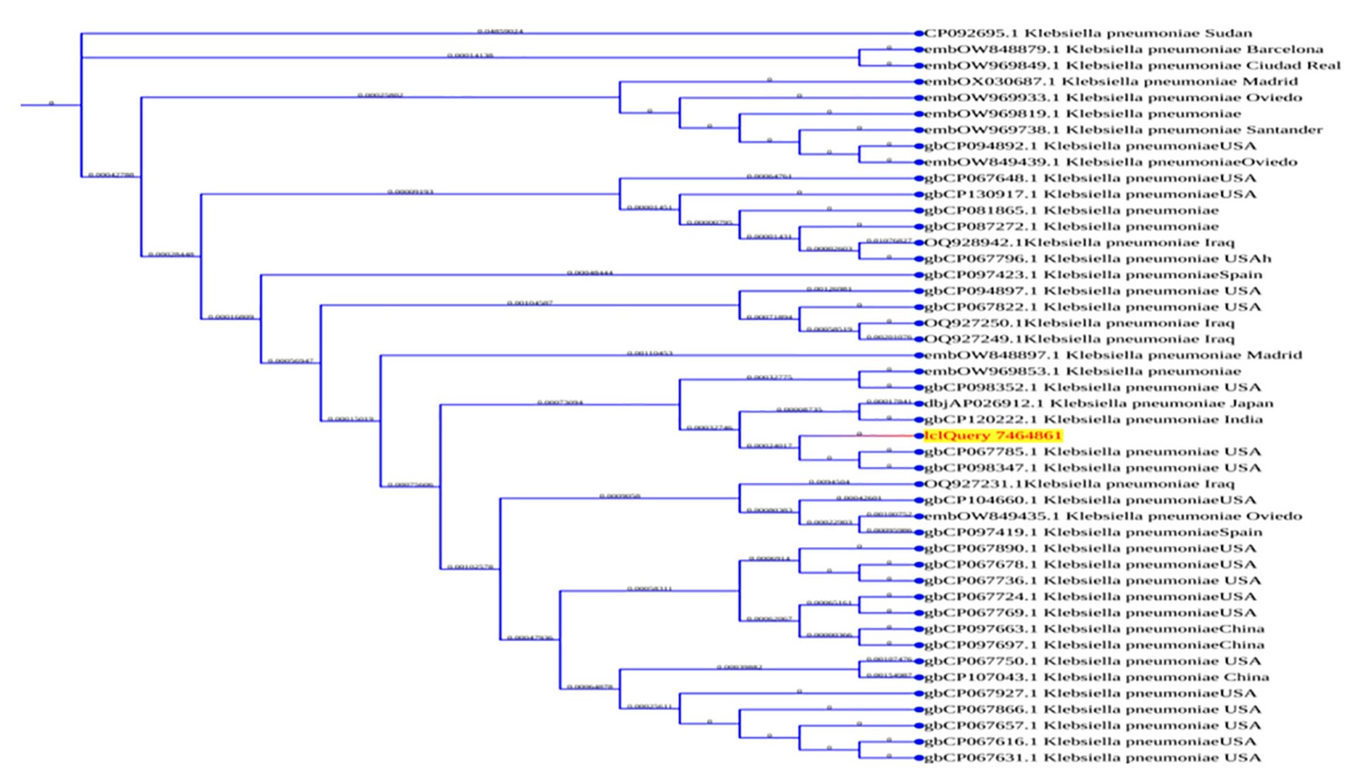 16SrRNA was analyzed and compared with the NCBI database to conduct the molecular characterization and phylogenetic distance tree of K. pneumoniae, revealing that our strain is more genetically related to the USA and India than Iraq (figure 1).