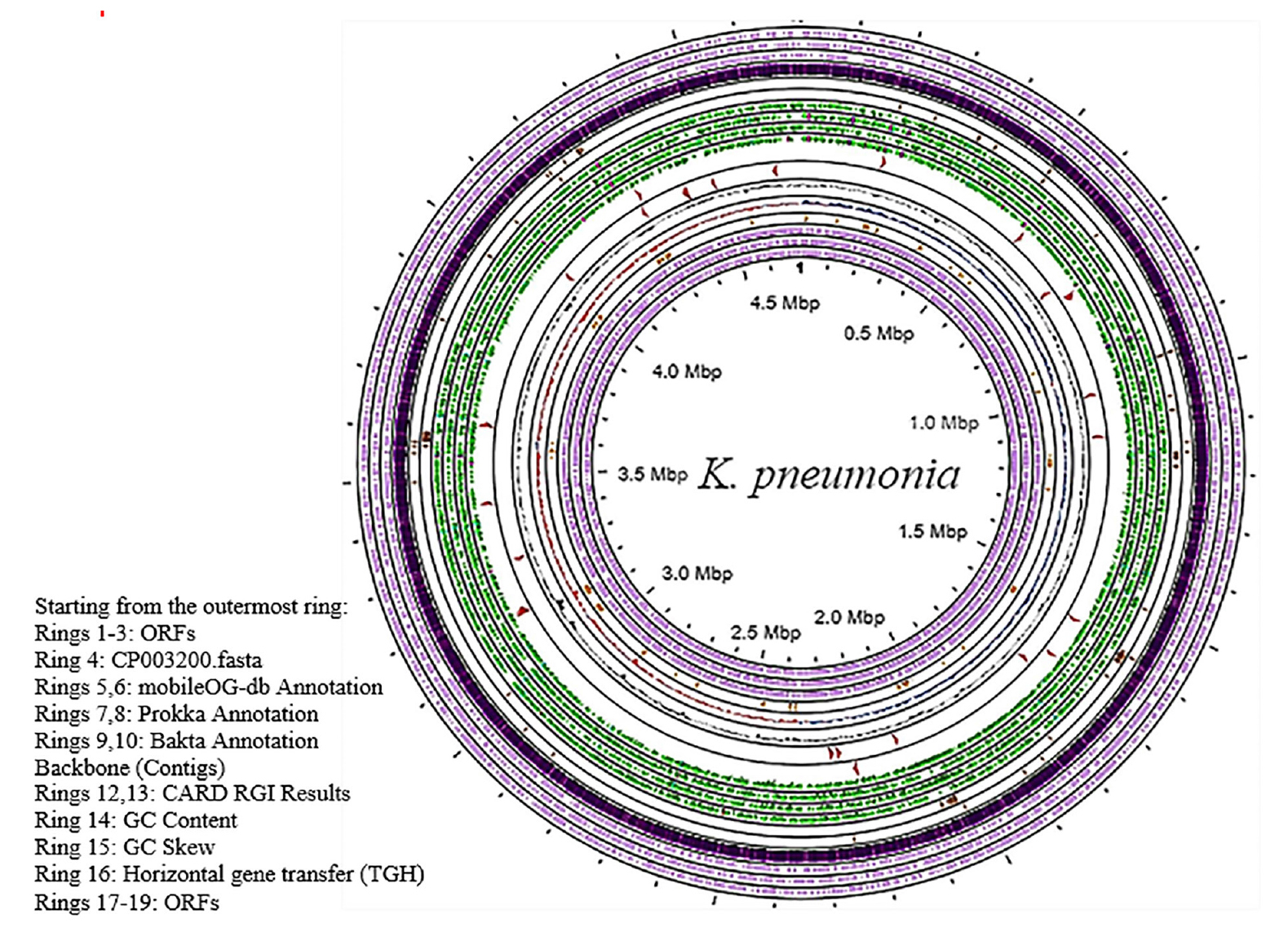 The CGView Server (https://js.cgview.ca/) was used to produce a comparative circular genome map, with the Klebsiella pneumoniae strain HS11286 genome sequence (Accession number: CP003200.1) acting as the reference.