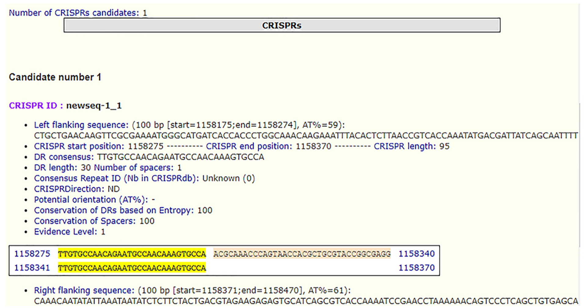 Figure 4.A CRISPR array was identified in the Klebsiella pneumoniae K36:O2a isolate, consisting of two direct repeat sequences and one spacer sequence, located between nucleotides 1,158,275 and 1,158,370.