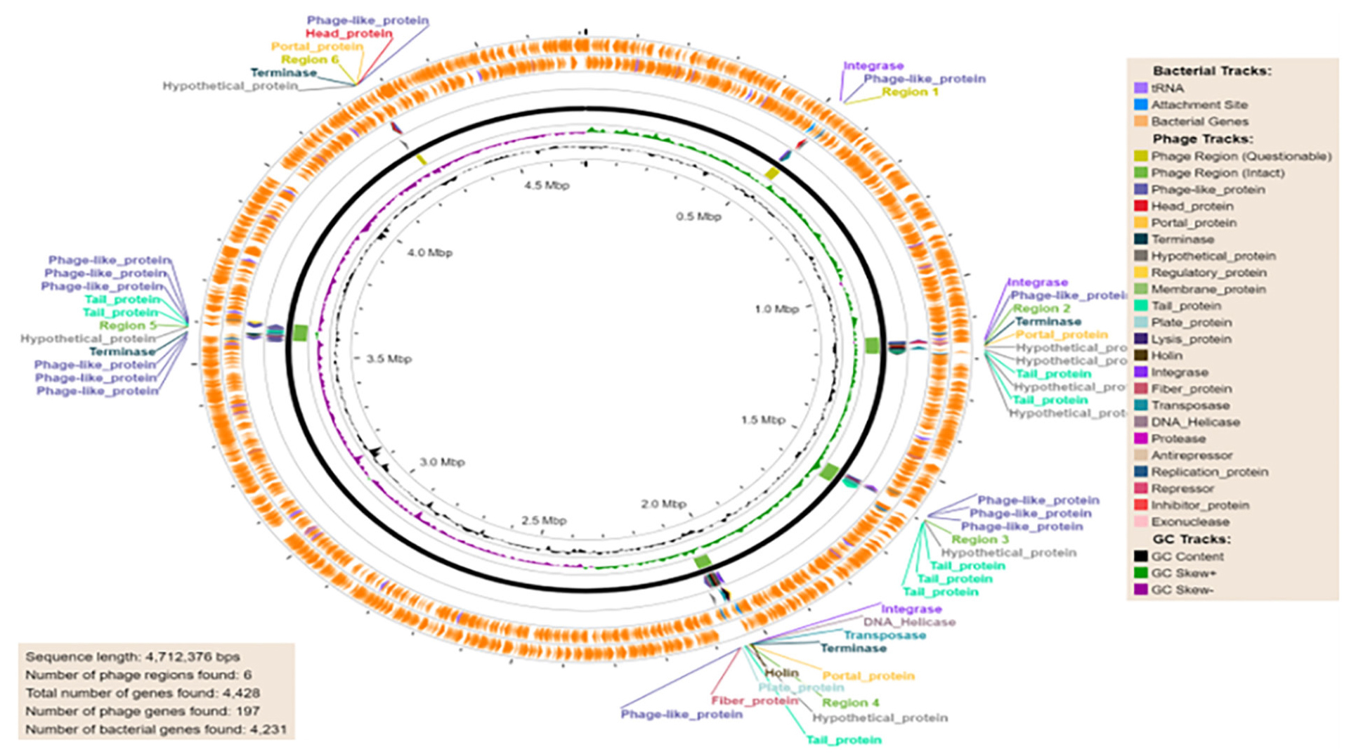 Figure 5. A circular genomic map of the Klebsiella pneumoniae isolate was generated using PHASTER, highlighting the regions of phages. The analysis identified a total of 4,428 prophage genes distributed across four intact prophages and two incomplete prophages.