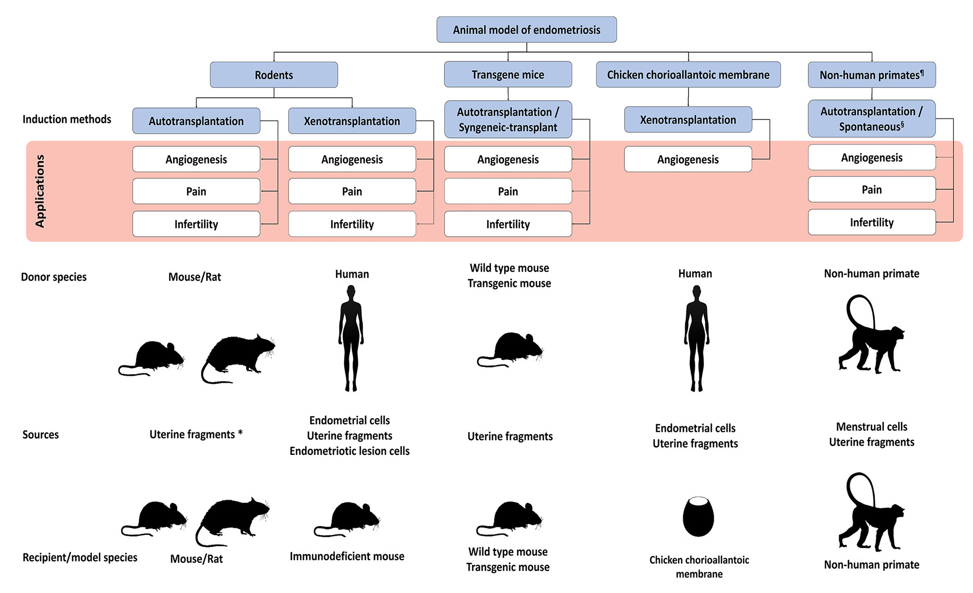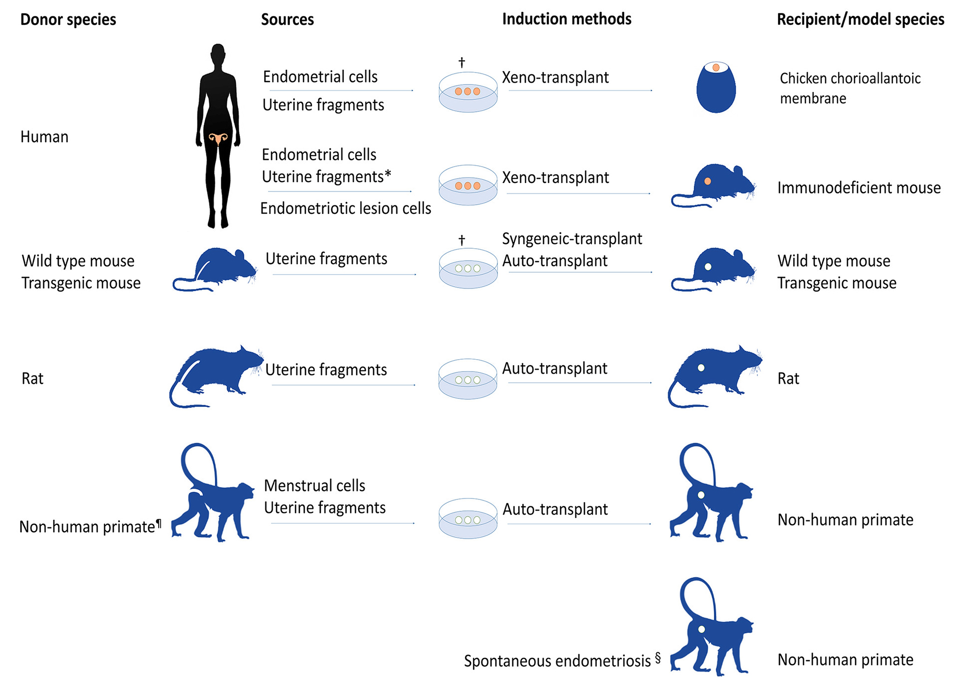 Figure 1. This figure illustrates the applications of different types of animal models in endometriosis research. ¶Non-human primate model of endometriosis is performed in species including baboons, rhesus monkeys, marmoset monkeys, and cynomolgus monkeys. §Spontaneous endometriosis is reported in baboons, rhesus monkeys, and cynomolgus monkeys