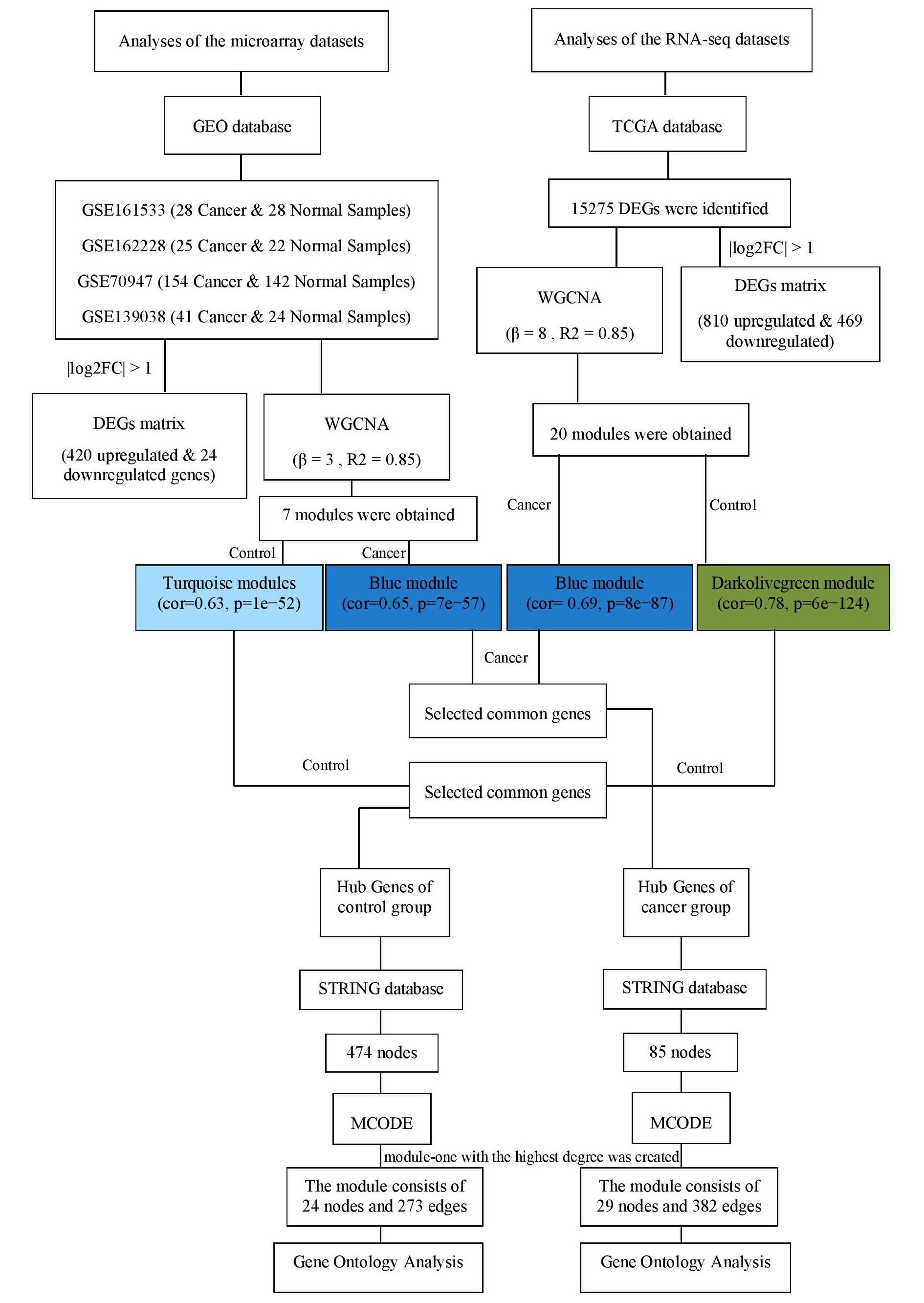 To identify differentially expressed genes (DEGs) between cancerous and non-cancerous samples, the Bioconductor package was used. Perl (version 5.0) available online at http://www.perl.org/ was employed for background correction as well as normalization purposes afterwards. We retrieved an equivalent set of RNA-Seq datasets by preserving the same keyword search as above. Data was downloaded from TCGA (The Cancer Genome Atlas) (https://cancergenome.nih.gov/), and analyzed using the limma package (an R add-on) using cut-off criteria of adjusted P<0.05 and |log2FC|>1. This dataset comprised 563 BC samples and 114 control samples in total, as obtained from TCGA’s BC dataset. For gene expression calculations, the edgeR package was used, following similar methods used to evaluate integrated GEO datasets for consistency in data analysis. Figure 1 depicts a flowchart outlining the data analysis pipeline.
