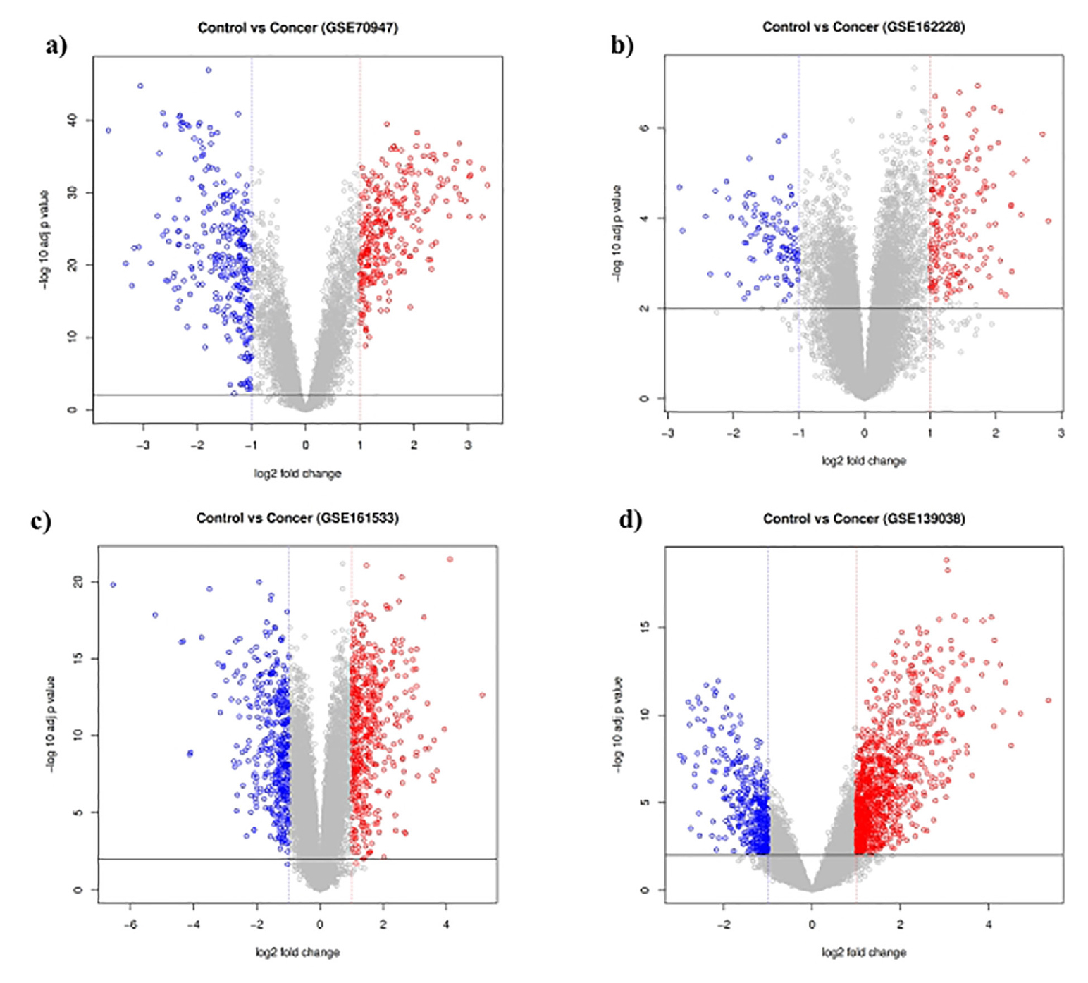 Figure 2. Volcano plots a, b, c, and d are presented for the GSE70947, GSE162228, GSE161533, and GSE139038 datasets. In general, this figure depicts the DEGs between control and BC samples across four distinct datasets (GSE70947, GSE162228, GSE161533, and GSE139038). Each plot features the log2 fold change (log2FC) on the horizontal axis and the -log10 P value on the vertical axis. Genes that are significantly upregulated are marked in red (log2FC>1, P<0.05), while downregulated genes are indicated in blue (log2FC<-1, P<0.05), and non-significant genes are shown in gray. The plots distinctly separate significantly DEGs from those that are not significant, underscoring the influence of BC on gene expression. The variations in log2FC and -log10 P values across the datasets reflect differences in the extent and significance of gene expression alterations. These visual representations are essential for pinpointing critical genes associated with cancer biology, which may act as potential biomarkers or therapeutic targets for future research.