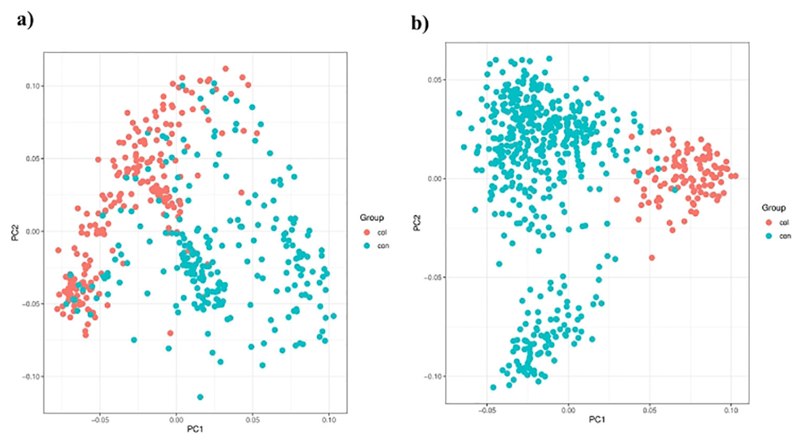 Figure 3. Principal Component Analysis (PCA)-based evidence of (a) integrated microarray and (b) TGCA dataset. To this end, figure 3 illustrates the results of CA for (a) a combined microarray dataset and (b) the TCGA dataset, demonstrating the differentiation between control (con) and BC (can) samples. Each data point corresponds to a sample, with color coding employed to distinguish the groups: red denotes cancer samples, while blue represents control samples. The PCA visualizations depict the first two principal components (PC1 and PC2), which account for the majority of the variance present in the datasets. In both cases, a clear clustering of cancer and control samples is observed, signifying distinct gene expression patterns between the two categories. This observed separation indicates that PCA is effective in reducing data dimensionality while maintaining the variance that differentiates cancer from control samples, underscoring the utility of these datasets in uncovering critical molecular distinctions related to BC.