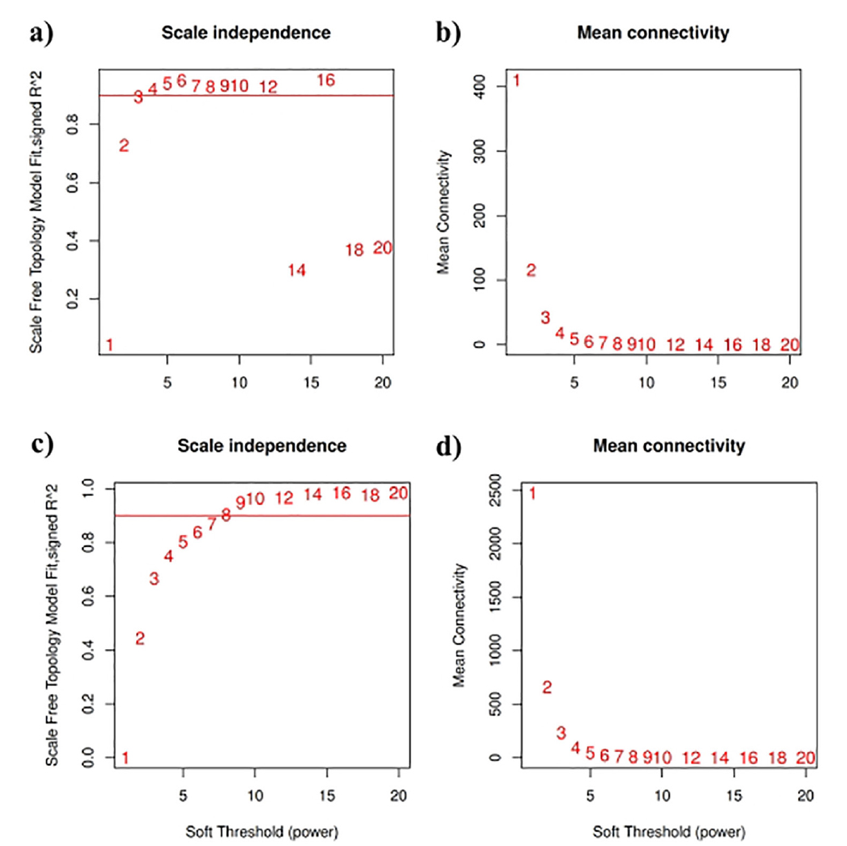 Figure 4. The figure shows the selection of soft-thresholding power (β) for microarray (a, b) and RNA-Seq datasets (c, d). The selected β ensures an R2≥0.85 for the scale-free topology (a, c) while maintaining a reduced mean connectivity (b, d), which optimizes the network design.
