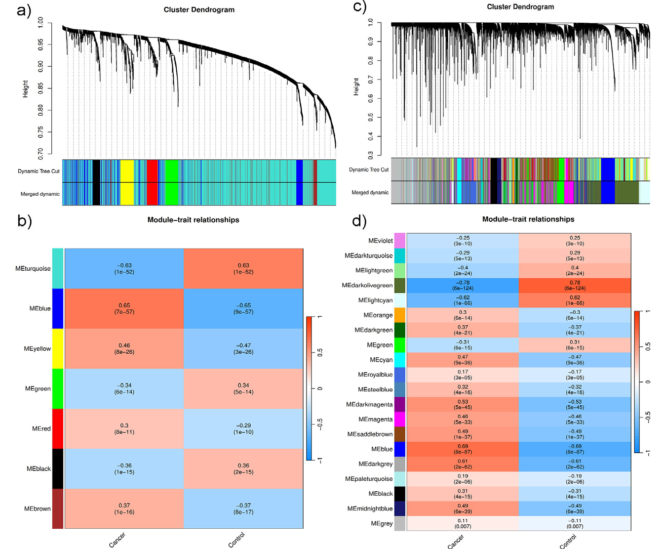 Figure 5. This figure illustrates WGCNA of gene expression data about BC, contrasting microarray datasets (a, b) with RNA-Seq datasets (c, d) to uncover co-expressed gene modules and their relationships with BC phenotypes. The dendrograms (a, c) depict the hierarchical clustering of genes into distinct modules, represented by color-coded branches. While clustering patterns exhibit similarities across all datasets, some variations are also evident. In the module-trait relationships (b, d), the heatmaps display the correlations between module eigengenes (MEs) and BC samples. Notably, significant modules identified in both datasets imply a potential involvement in cancer development or progression, although the correlation strength may differ due to variations in technology. Larger modules could signify fundamental processes, whereas smaller modules might reflect specialized functions. Gene ontology enrichment analysis may uncover biological pathways linked to BC. Comparing these results with findings from other studies can further validate the conclusions and provide new insights. This analysis underscores critical gene modules that may play a role in BC, presenting opportunities for the identification of therapies and biomarkers.