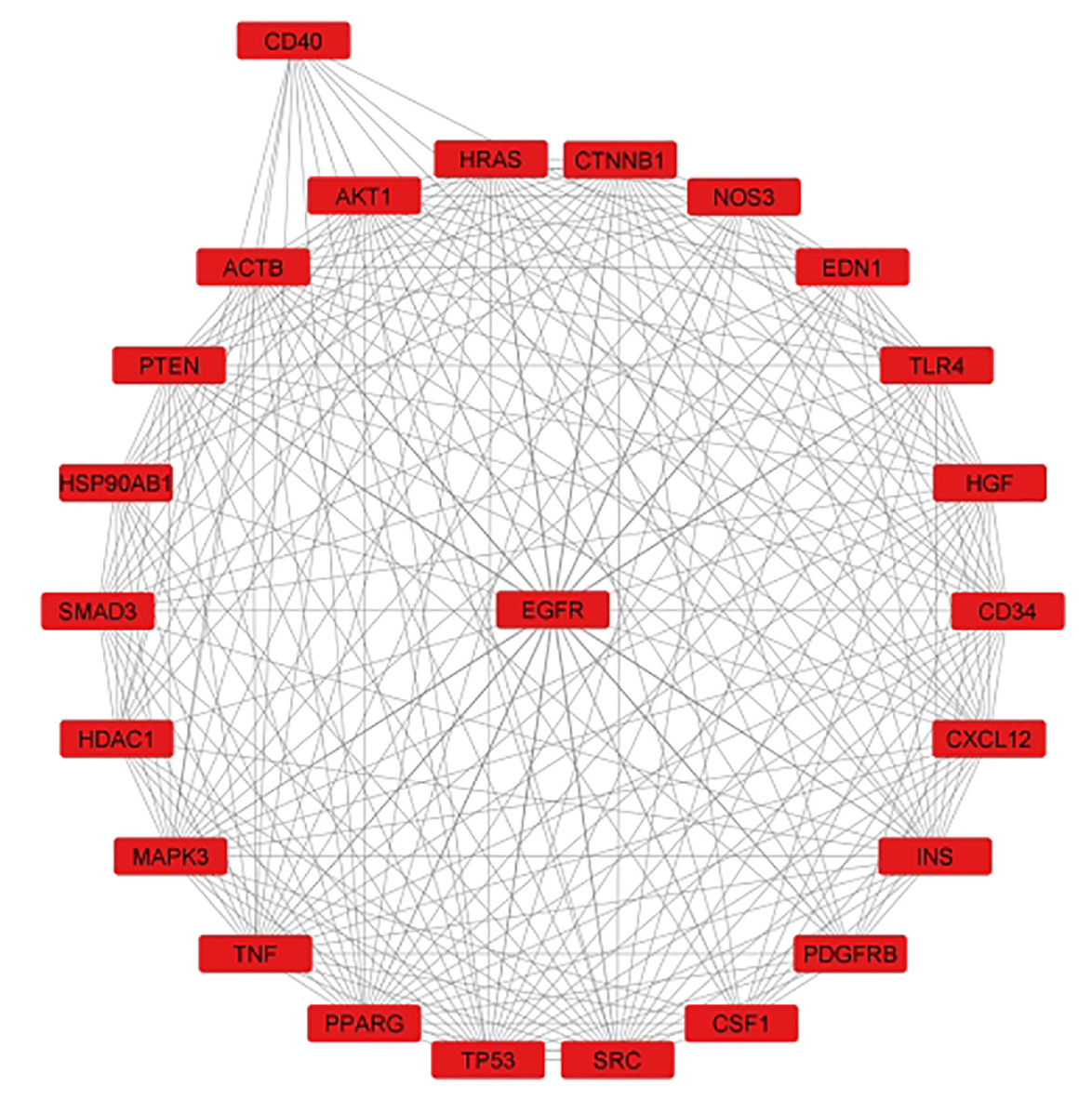 | Prostate cancer | 1.25E-15 | 1.10E-13 | PDGFRB; HSP90AB1; PTEN; AKT1; CTNNB1; TP53; HRAS; EGFR; INS |