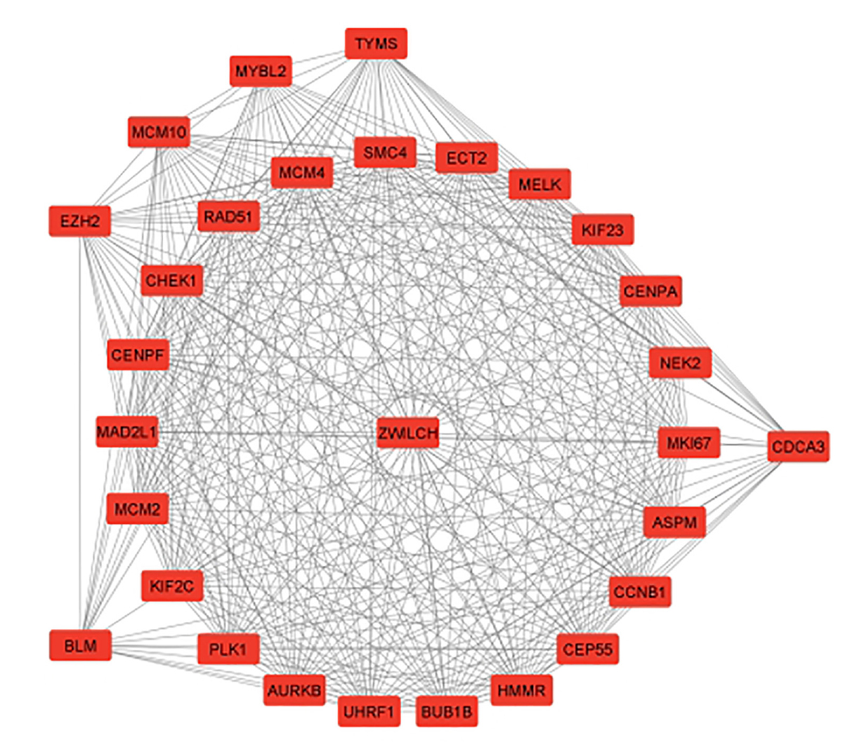 Figure 7. The protein-protein interaction (PPI) network is illustrated in BC samples. This figure emphasizes the interactions among proteins and their functional interrelations within the context of BC. Notable characteristics include a high density of nodes, indicating a complex network of protein interactions, as well as the presence of hub proteins such as ZWINT, TYMS, and MCM10, which are pivotal in orchestrating the network. The modular architecture of the network suggests the existence of functional protein complexes or pathways pertinent to BC, including several novel interactions that have not been documented previously. It is crucial to consider the validation of these interactions, the exploration of their functional significance through gene ontology, and the recognition of the dynamic characteristics of PPI networks.