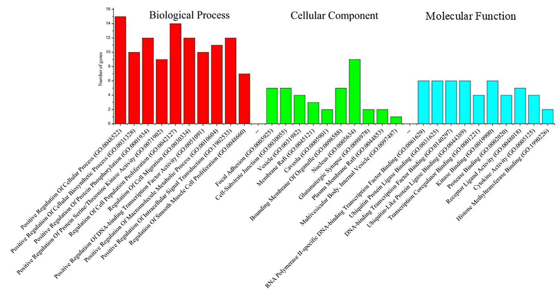 Figure 9. Gene Ontology analysis of Identification of Differentially Expressed Genes in BC showed DEGs were organized within three functional classes, namely biological process (BP), cellular component (CC), and molecular function (MF). The top 10 significantly enriched GO terms in BC are shown for each class.