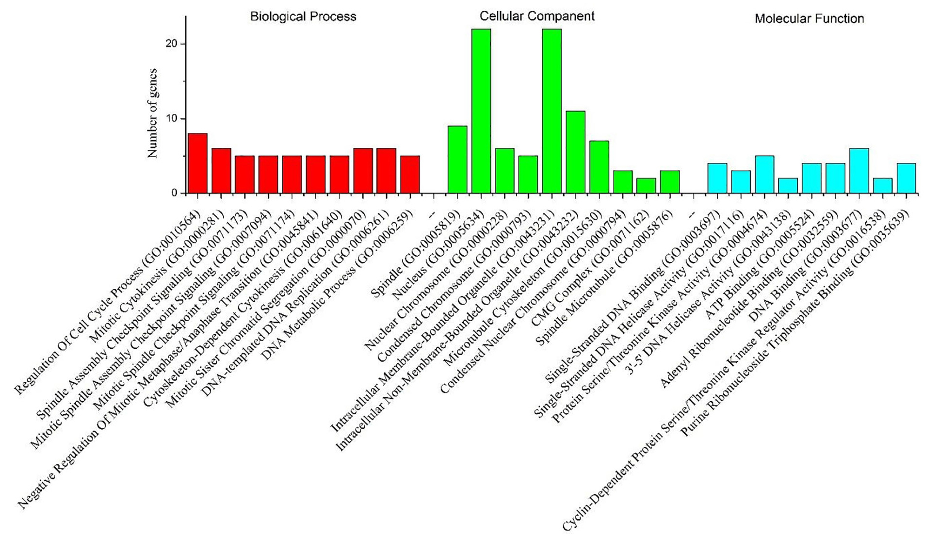 Cancer Samples: The genes with the smallest enrichment P value in the cancer hub study were those associated with “Single-Stranded DNA Binding” in MF, “Regulation of Cell Cycle Process” in BP, and “Spindle” in CC (figure 9). Figure 9 presents the results of GO enrichment analysis about BC-associated genes, categorized into three distinct domains: BP, represented in red, CC, depicted in green, and MF, illustrated in blue. The x-axis enumerates the enriched GO terms, while the y-axis reflects the corresponding gene counts. Notable observations include “Regulation of Cell Cycle Process” within the BP domain, “Spindle” in the CC domain, and “Single-Stranded DNA Binding” in the MF domain, all of which underscore their contributions to cancer progression. These terms highlight essential processes involved in the regulation of the cell cycle, the functionality of the mitotic spindle, and the mechanisms of DNA replication and repair, thereby emphasizing their critical roles in maintaining genomic stability and facilitating cancer development.
