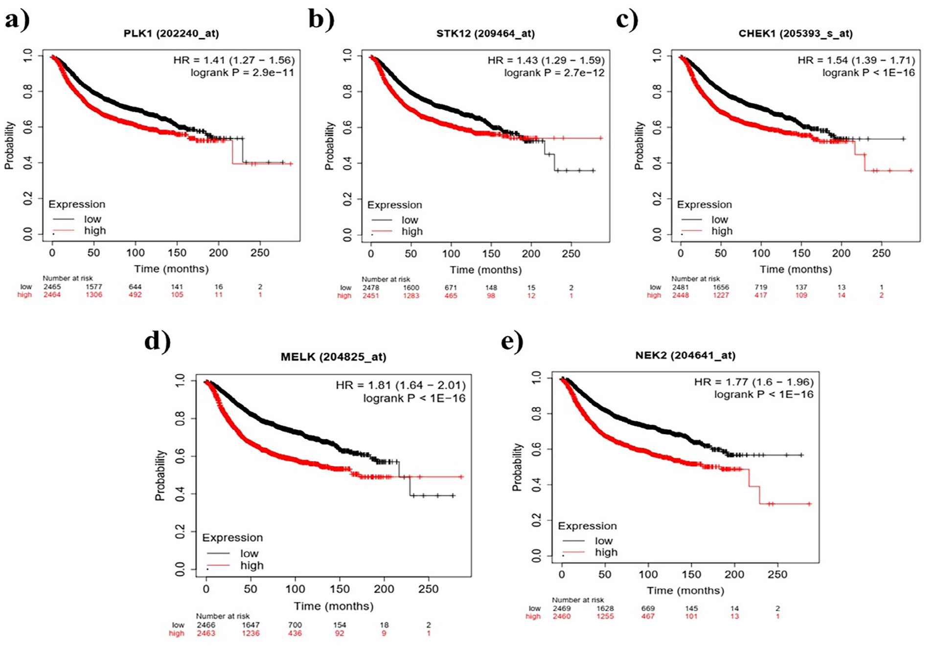 Figure 10. The prognostic values of the nine core genes in BC are shown. (a) PLK1; (b) AURKB (STK12); (c) CHEK1; (d) MELK; (e) NEK2. This figure depicts Kaplan-Meier survival analyses for five genes associated with BC: PLK1, STK12, CHEK1, MELK, and NEK2. It compares the survival probabilities of groups with high expression (represented by red curves) against those with low expression (indicated by black curves). The analysis reveals that elevated expression levels of all five genes correlate significantly with reduced survival rates, as evidenced by hazard ratios (HRs) ranging from 1.41 to 1.77 and log-rank P values below 0.001.