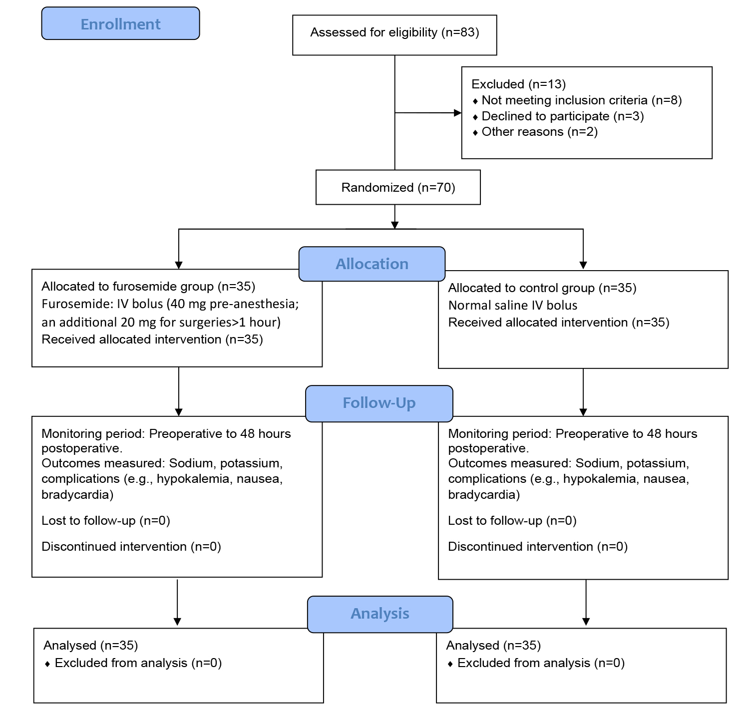 Power calculation was used to calculate the total sample size required for detecting a statistically significant difference between sodium levels in the furosemide and control groups. The 95% confidence level (α=0.05, two-tailed, Zα=1.96) and 80% statistical power (β=0.2, Zβ=0.84) were applied, and the total sample size required was calculated. With a hypothesized effect size of 0.5, an expected mean difference (E) of 5 units, and a standard deviation (S) of 7.5 units, the analysis found that at least 34 patients per group (a total of 68) would need to be available to have adequate power. As an allowance for equal allocation, a ratio of 1:1 was employed, and 35 participants were randomly allocated to each of the intervention and control groups. This design methodology helped to ensure that the research had adequate statistical power to reveal meaningful differences and a manageable sample size.