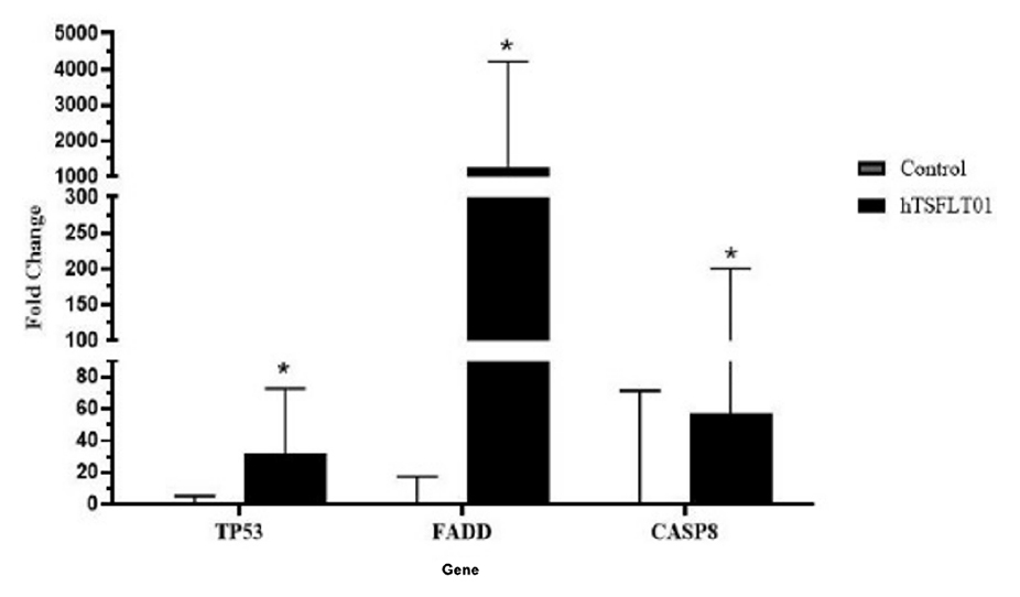 The htsFLT01/MiRGD complex significantly enhanced the expression of FADD, CASP8, and p53 genes compared to the control and htsFLT01-alone treatments (P<0.05). This upregulation underscores its pro-apoptotic impact, mediated via the extrinsic apoptosis pathway (figure 1).