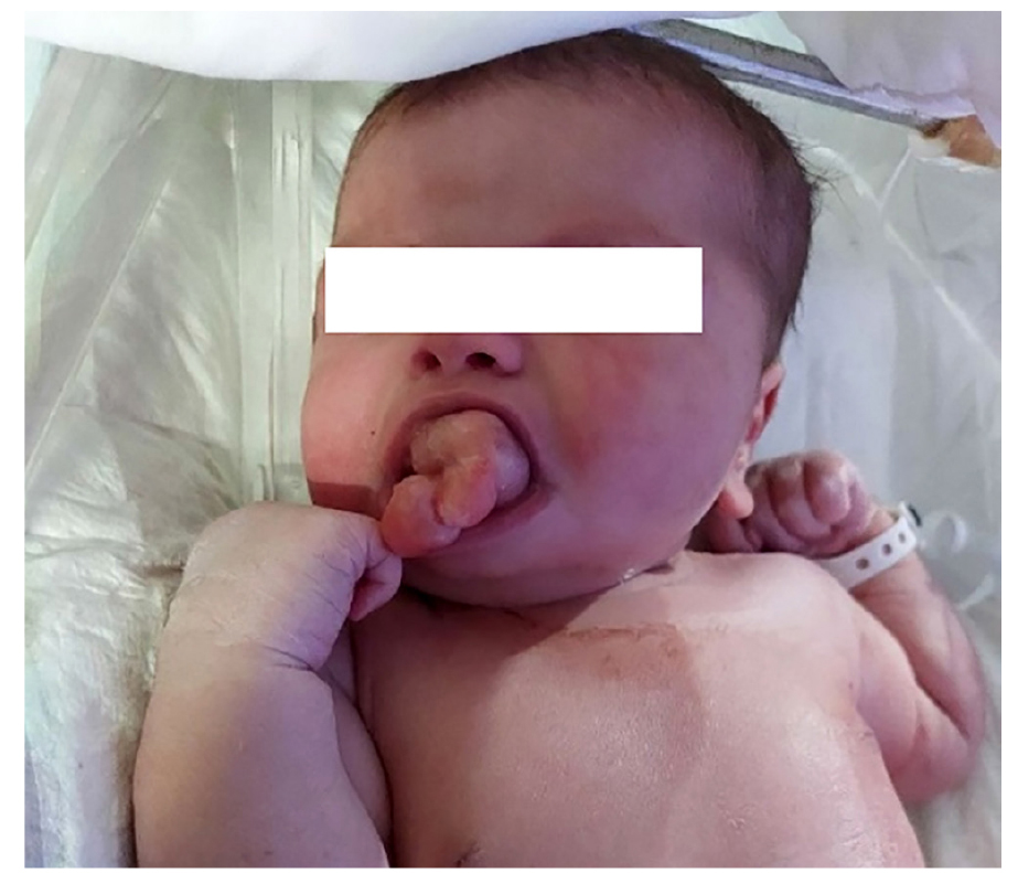 Figure 1. The newborn presented with a mass protruding from the oral cavity, featuring multiple round and nodular extensions.