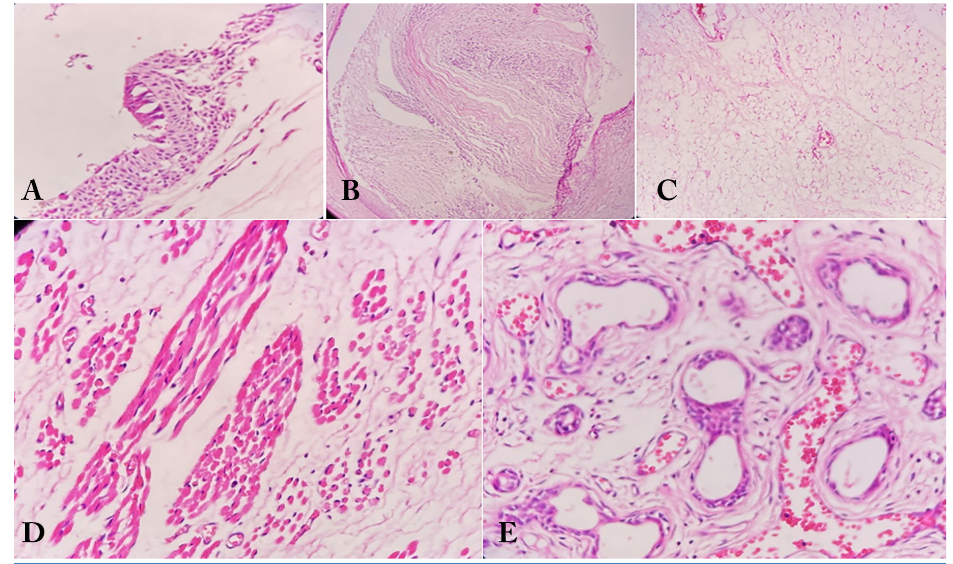 Figure 2. Histopathological features of the mature teratoma included: (A) Respiratory-type ciliated columnar epithelium. (B) An epidermoid cyst, lined by stratified squamous epithelium, contains keratinous debris. (C) Mesenchymal stroma with scattered immature spindle cells. (D) Well-defined bundles of skeletal muscle fibers. (E) Glandular structures, which are lined by cuboidal epithelium.