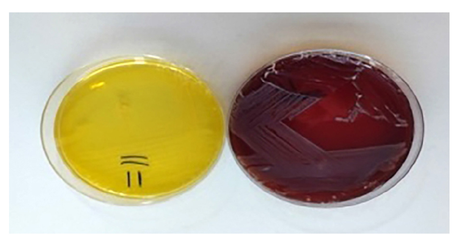 Figure 2. Identification and selective cultivation of Staphylococcus aureus on selective media. S. aureus colonies were grown on mannitol salt agar, where they appeared as yellow colonies due to mannitol fermentation, indicating selective growth. Growth was also observed in blood culture, supporting the identification of S. aureus based on its hemolytic activity and characteristic morphology.