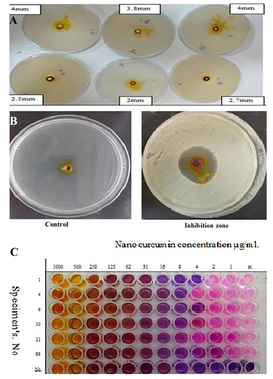 Figure 3. Evaluation of Nanocurcumin Antibacterial Activity Against Methicillin-resistant Staphylococcus aureus (MRSA). (A) The S. aureus Inhibition zones are present at a concentration of 1 mg/mL nanocurcumin in each experimental configuration. Antibacterial activity of nanocurcumin and the corresponding inhibition zones in compared to the control sample against S. aureus. This indicates that nanocurcumin is a more potent antibacterial agent owing to its decreased particle size. (B) Following a 24-hour period, 20 µL of Resazurin was added to each well and incubated for an additional 2-4 hours at 37°C. (C) Color alterations were seen and recorded. The concentration at which the color shift occurred was termed the Minimum Inhibitory Concentration (MIC).