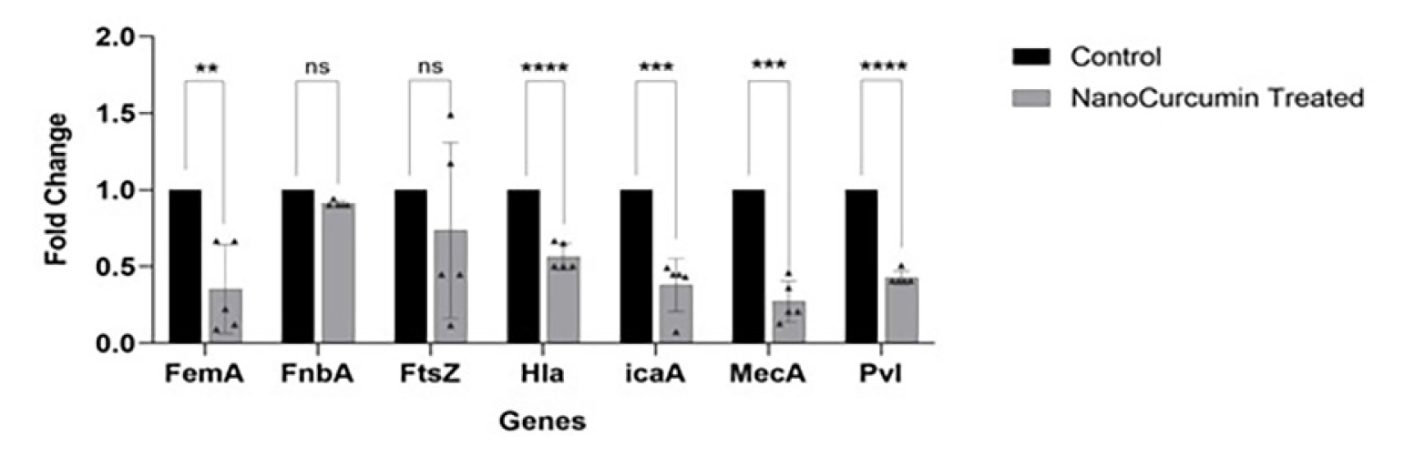 Nanocurcumin significantly downregulated the expression of critical virulence and resistance genes in S. aureus, including icaA, hla, pvl, femA, and mecA. In contrast, it exhibited no notable effect on fnbA and ftsZ, indicating a selective genetic modulation of bacterial pathogenicity.