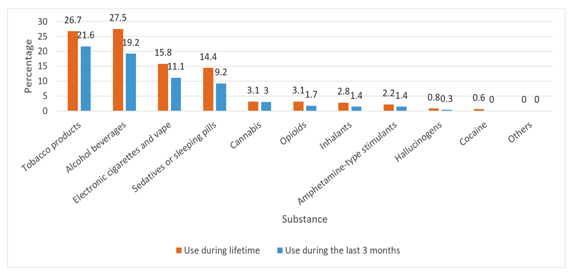 | Substance | Risk category | n (%) | Use during lifetime n (%) | Use during the past 3 months n (%) | |||||