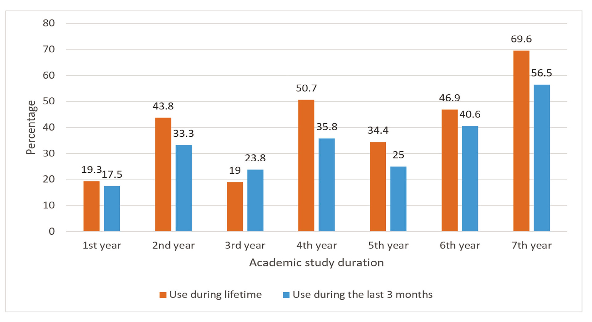 Table 2 presents the risk categories and the frequency distribution of ASS use among medical students. Figure 1 illustrates the prevalence of specific substances used over their lifetime and in the past 3 months, indicating the highest prevalence for alcoholic beverages, tobacco products, and electronic cigarettes. Figure 2 shows the variation in ASS use across academic years, with the highest rates observed in the seventh year.