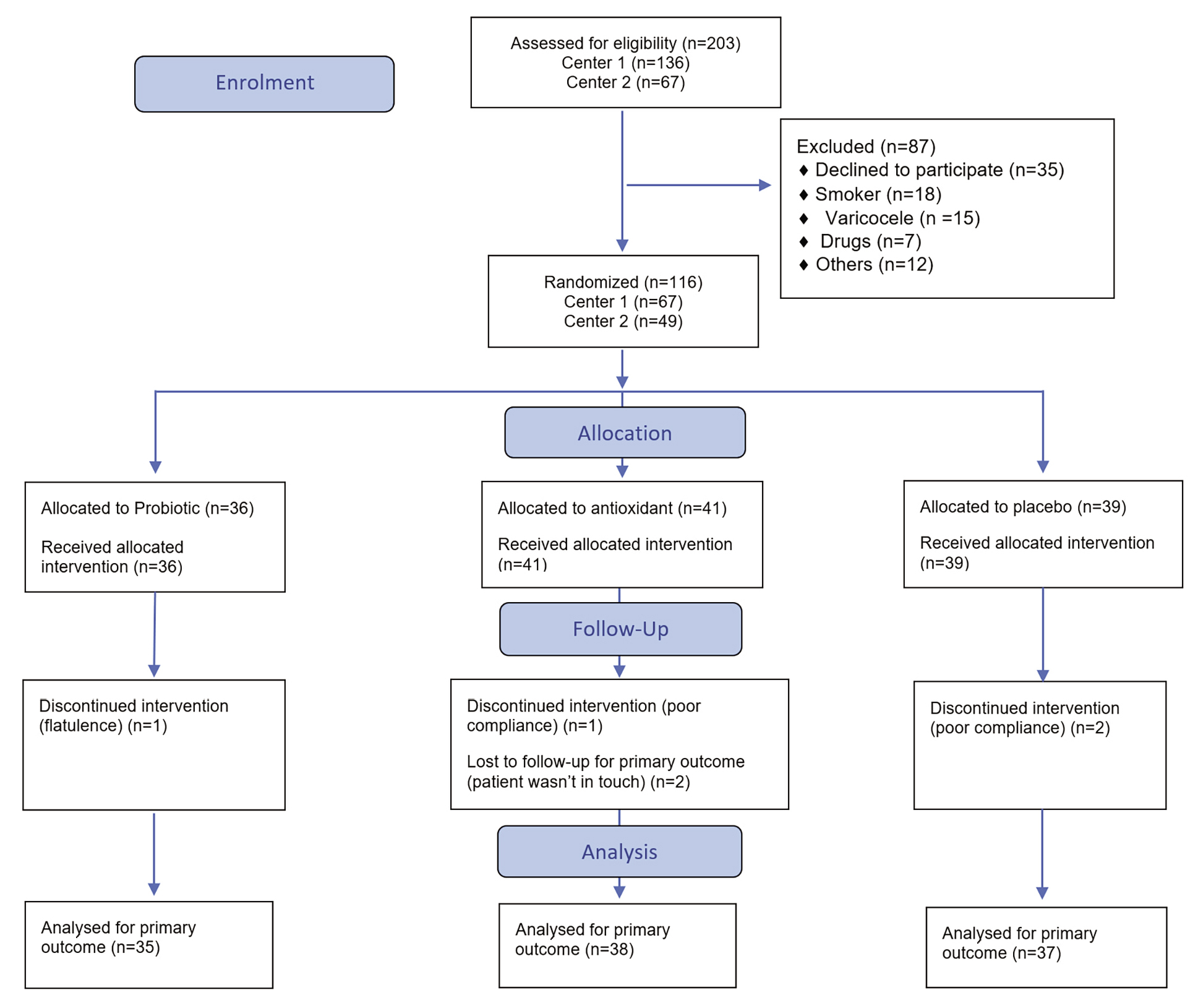 This is a three-month-long, multi-center, triple-blinded, randomized, placebo-controlled clinical trial that was conducted from July 2021 to April 2022. A total of 203 male patients with infertility who were referred to both centers, 136 and 67 from Isfahan and Yazd centers, respectively, were evaluated for eligibility. Patients were evaluated by an experienced urologist specializing in infertility. They were interviewed to gather demographic information, ascertain the duration of infertility, and obtain a history of any illnesses or medication usage. Following the completion of the patient history, a testis examination was conducted. Subsequently, the patients were randomly divided into three parallel groups using the Random Allocation Software. 13 All patients who were referred to both centers and satisfied the primary criteria were further evaluated for inclusion. After obtaining informed consent, the patient would be randomly and uniformly assigned to each of three groups at the first visit, and would stay blind to the process through the study. Simple randomization was used to allocate participants into three parallel groups (probiotic, antioxidant, and placebo) in a 1:1:1 ratio. This was conducted using Random Allocation Software, which assigned each participant a random code to ensure allocation concealment. Each new patient at the time of enrollment was assigned to the next available random code, which corresponded to a concealed group assignment. Subsequently, the participant, care provider, and analyzer were blinded. A per-protocol approach was considered to ensure the robustness of analyzing the results in the post hoc analysis.